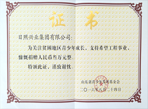 ·2016年8月24日,山東省青少年發(fā)展基金會(huì)為興業(yè)集團(tuán)頒發(fā)“關(guān)注貧困地區(qū)青少年成長(zhǎng),支持希望工程事業(yè),慷慨捐贈(zèng)人民幣3萬(wàn)元”榮獲證書。
