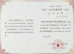 ·2016年8月,日照興業(yè)房地產(chǎn)開(kāi)發(fā)有限公司獲得山東省工商行政管理局2014--2015年度“守合同重信用”企業(yè)